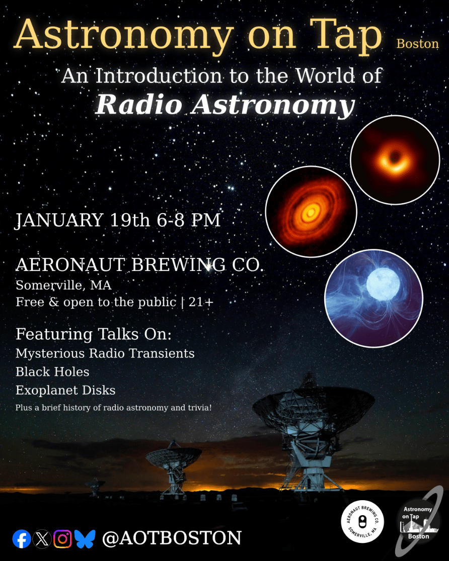 Astronomy on Tap: An Introduction to Radio Astronomy @ Aeronaut Brewing Co, Somerville — A science talk night that brings radio astronomy down to earth with short, accessible talks on black holes, pulsars, and mysterious fast radio bursts, all hosted inside a brewery where you can grab a beer and listen along | FREE, 6–8PM