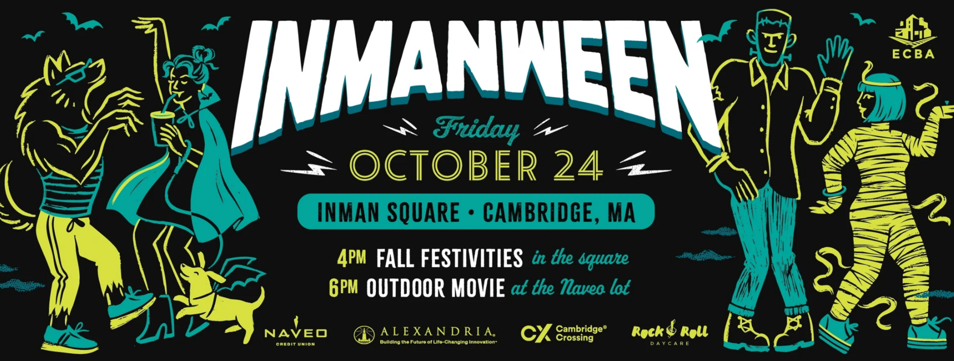 Inmanween @ Inman Square, Cambridge – Inman Square turns into a neighborhood block party with Halloween crafts, live ghost stories, and a family movie to close out the night. Wander shop to shop for sweets, then stick around for stories in Vellucci Plaza and a screening at Naveo Credit Union | FREE, 3pm–7pm