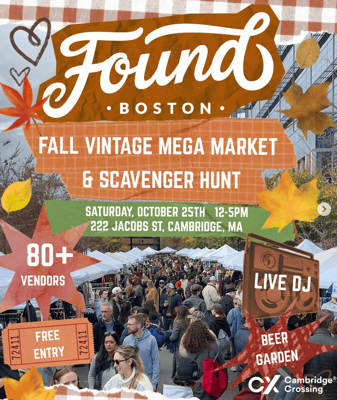 Fall Vintage Mega Market & Scavenger Hunt @ Cambridge Crossing, Cambridge – Vintage is trending and Found Boston takes over the streets of Cambridge Crossing with 80+ vintage and sustainable vendors, a beer garden, live DJ, and a citywide scavenger hunt with prizes—including a $500 grand prize. Spend the afternoon digging for vintage gems, local finds, and hidden clues across the Commons | FREE, 12pm–5pm