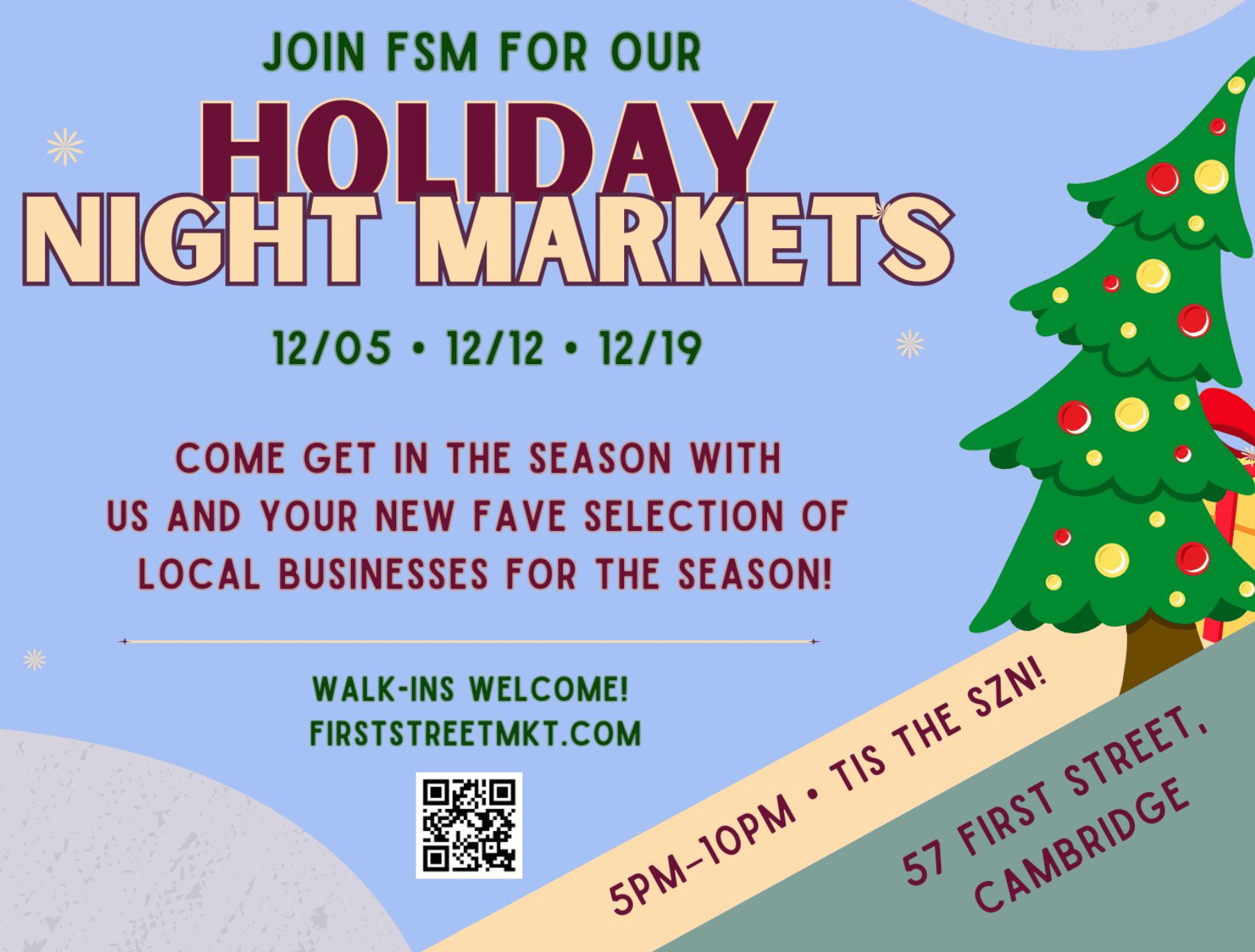 Holiday Night Market @ First Street Market (FSM), Cambridge – Get to FSM for the second of their night markets, featuring 20+ local vendors and an open bar serving cocktails and cocoa, all paired with live music, making this the best way to kick off your weekend shopping | FREE, 5–10pm